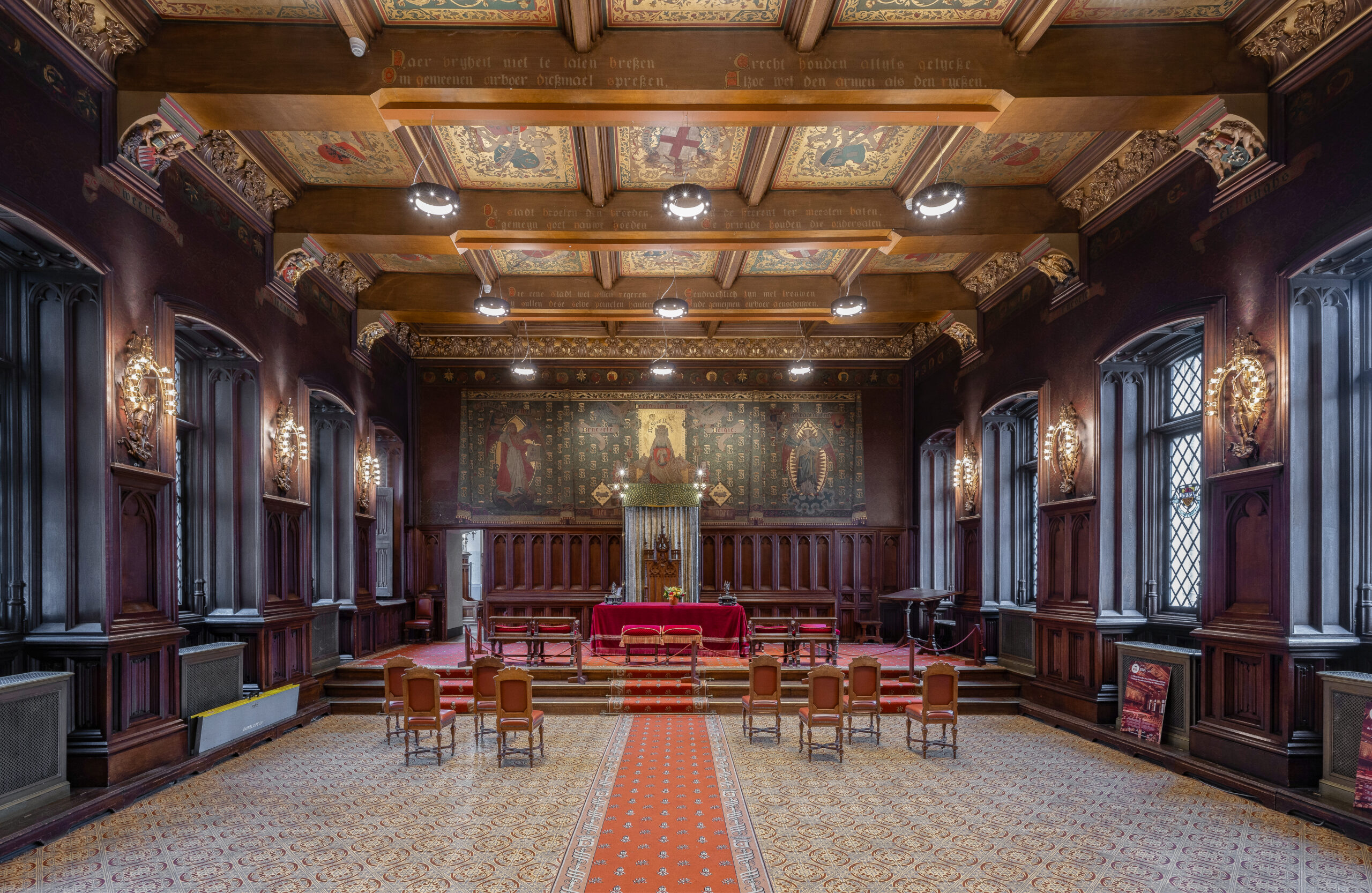 Ornée de boiseries sculptées et de vitraux colorés, cette salle incarne l’architecture gothique bruxelloise. Située au premier étage du bâtiment, la Salle d’Assemblée des États de Brabant devait témoigner de la puissance de l’institution qui y siégeait. C’est pourquoi son décor fut particulièrement soigné.