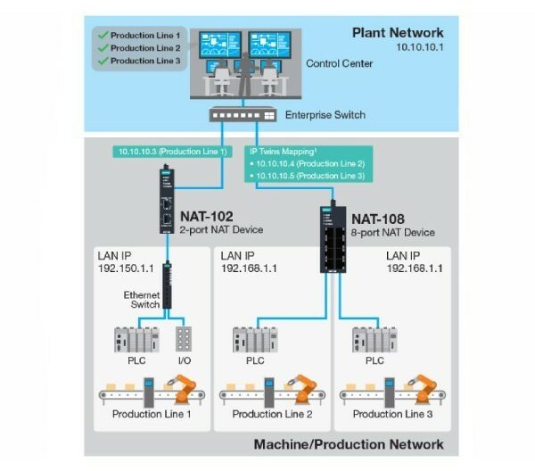 Les dispositifs de traduction d’adresses réseau (NAT) des séries NAT-102/108 de Moxa sont conçus pour simplifier la configuration IP des machines dans l’infrastructure réseau existante et fournir une protection de cybersécurité de base aux environnements d’automatisation industrielle.