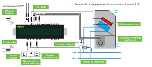 - De cartes « CVC universelles » pour la régulation et les actions sur les systèmes de chauffage et de climatisation courants (ventilo-convecteurs, poutres froides, plafonds rayonnants, etc.).