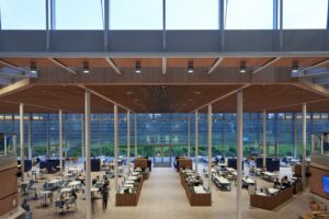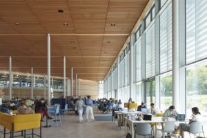 L’emploi du verre et du métal renvoie l’image d’un bâtiment sobre et contemporain qui contraste avec l’aspect très chaleureux donné par le bois et sa teinte claire. Il permet d’allier finesse structurelle et transparence des volumes, inscrivant le bâtiment avec subtilité dans son environnement. Une attention particulière a systématiquement été portée au confort visuel des usagers, à l’apport de lumière naturelle et aux vues sur le paysage extérieur dès l’entrée du bâtiment.