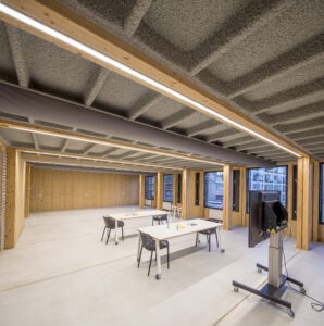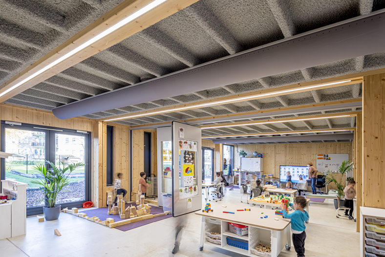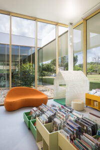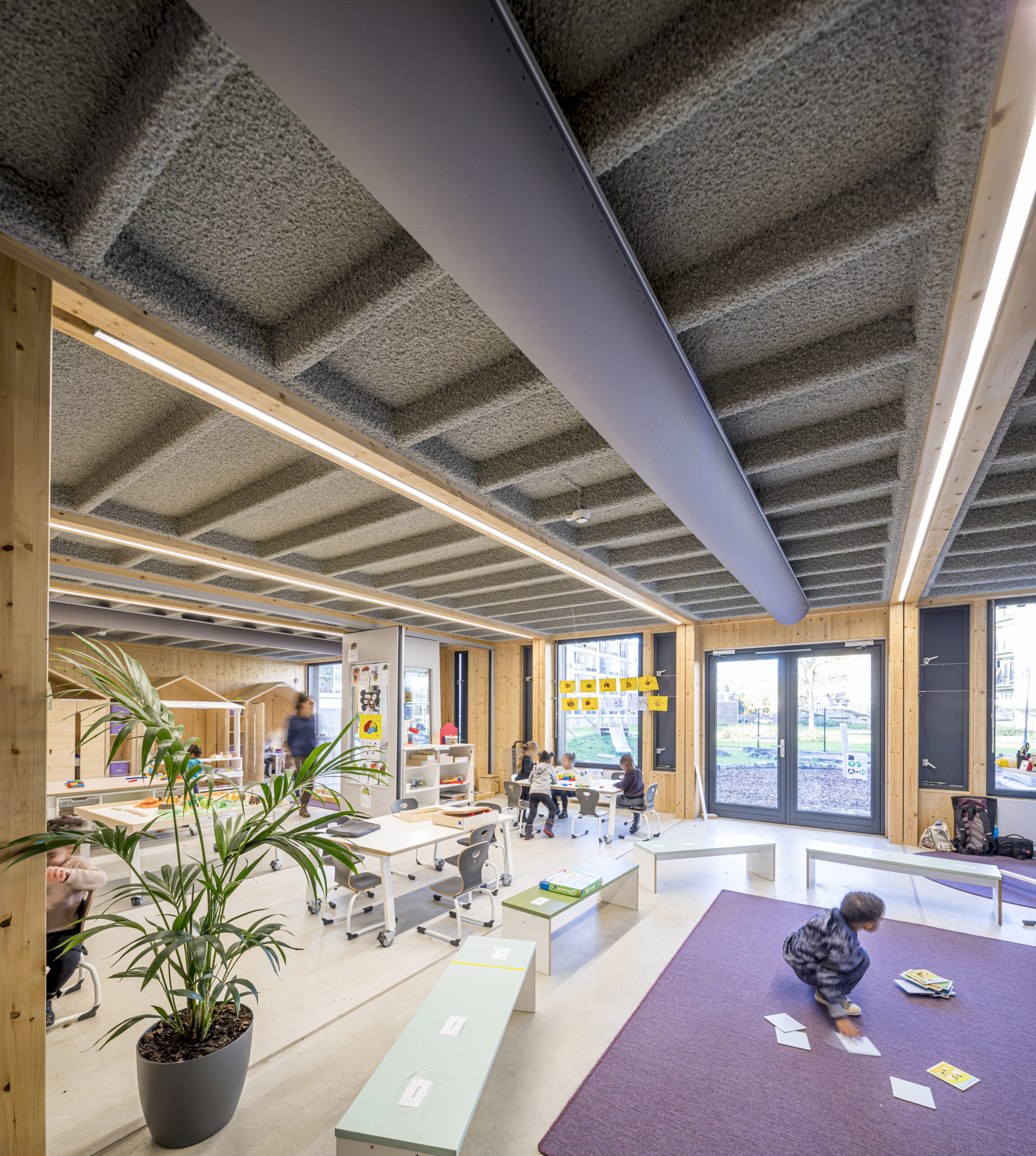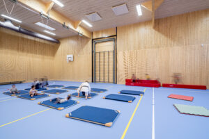 L’intérieur associe surfaces en bois et ouvertures en verre, créant une atmosphère fraîche, mais également chaleureuse et confortable où les enfants peuvent apprendre dans un environnement sûr et protégé. En plus des salles de classe, l’école comprend un gymnase avec vestiaires et douches, une salle technique, une médiathèque, une grande cuisine et une cour verdoyante. L’atrium central constitue le cœur du bâtiment et abrite à la fois l’entrée et l’accès à l’étage supérieur. Le large escalier multifonctionnel sert tantôt de tribune, tantôt de scène ou simplement de lieu de rencontre informel pendant les heures de cours.