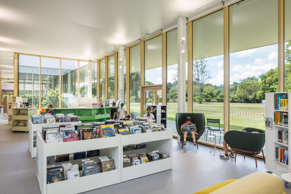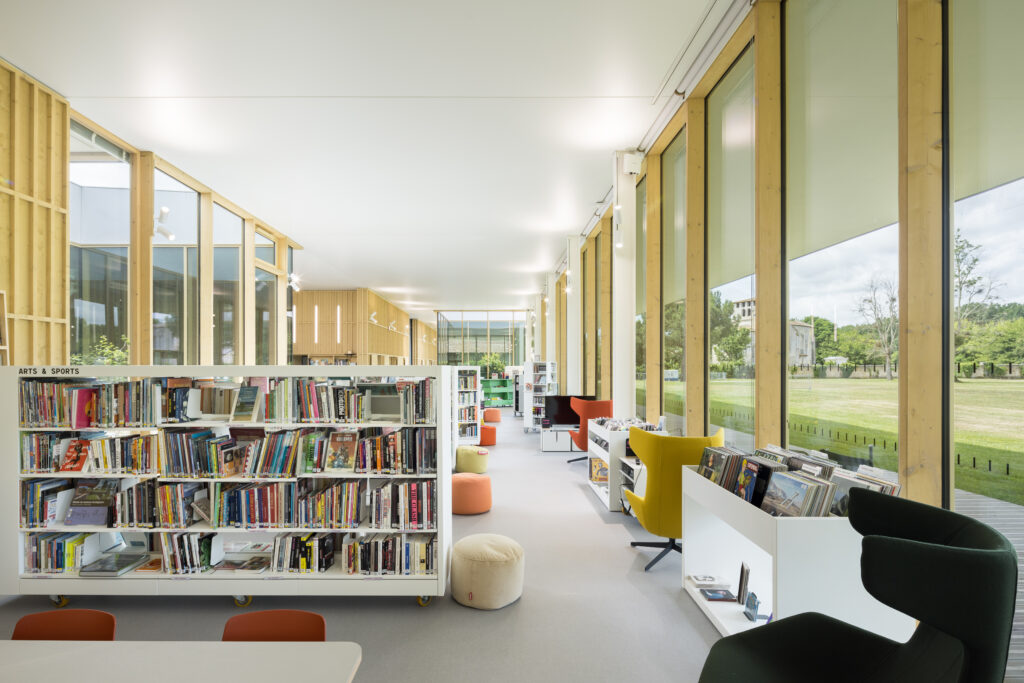 Le bâtiment neuf, de plus de 1 000 m², comprend la médiathèque, espace principal du programme, une salle de réunion, une salle de conférence et un bureau. Dans la médiathèque proprement dite, un éclairage direct et indirect a été réalisé à l’aide de spots Pixo, aux lignes simples, disposés par deux sur des rails verticaux sur les parois : l’un orienté vers le plafond et l’autre vers le sol, créant des halos au plafond tels des reflets du soleil. C’est le modèle « large » du projecteur qui a été choisi en 91 mm de diamètre, et a permis d’obtenir les 400 lux requis au niveau des tables.