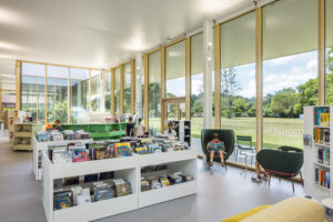 La nouvelle médiathèque agit comme une lanterne : visible dès l’arrivée sur le domaine, elle marque l’entrée du parc et invite à le découvrir. La composition des façades est l’expression du parti pris général du projet : des façades filantes vitrées, ponctuées de patios, encadrées par deux lignes horizontales que forment la terrasse bois et la toiture en porte-à-faux de six mètres sur toute la périphérie de l’équipement.