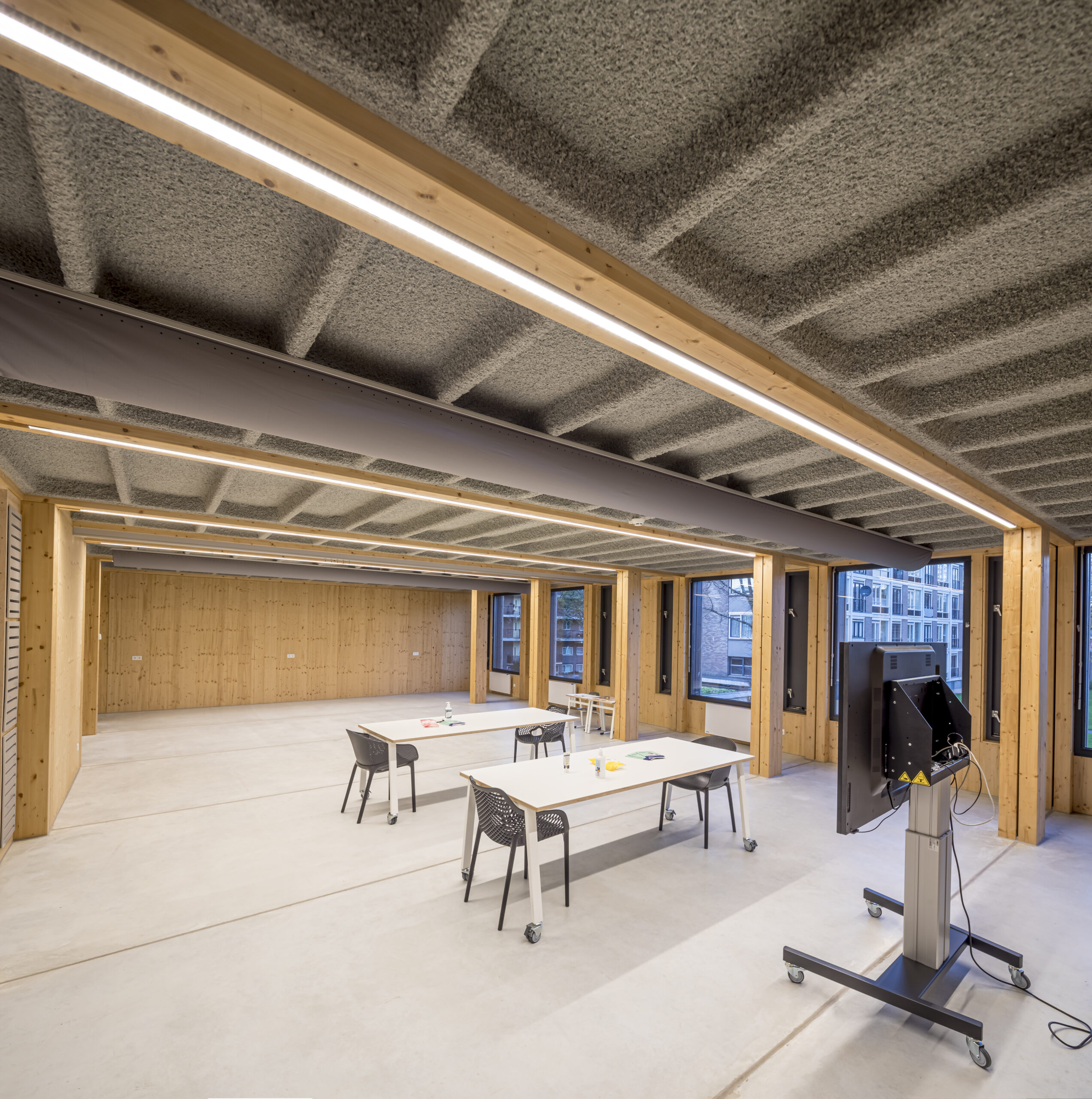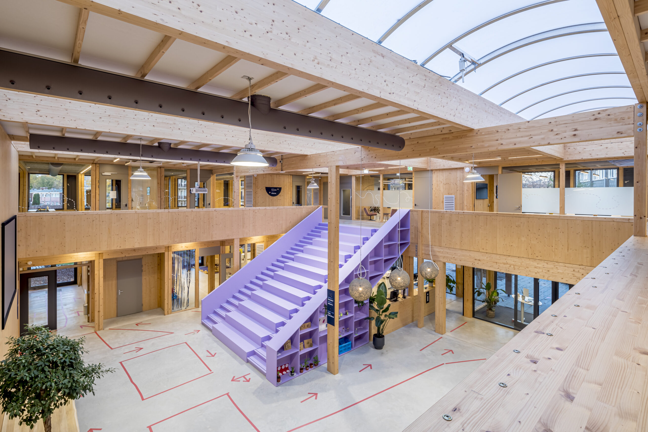 L ’école primaire Het Epos se situe dans le quartier de Zuidwijk à Rotterdam. Ce nouveau bâtiment scolaire a été construit pour être prêt pour l’avenir. Le cabinet d’architectes SeARCH, en collaboration avec l’entrepreneur De Groot Vroomshoop, a mis au point une nouvelle méthode de construction : une école circulaire entièrement en bois qui peut être facilement démontée, déplacée, agrandie et élargie. En travaillant avec des modules préfabriqués, le temps de construction sur le site est réduit au minimum et une école entièrement nouvelle est construite en quelques mois seulement. Het Epos se compose de 75 modules préfabriqués en bois qui peuvent, si nécessaire, être déplacés à un autre endroit, ce qui rend l’école à l’épreuve du temps. Les installations sont intégrées, ce qui permet non seulement d’augmenter le niveau de préfabrication en usine, mais aussi d’améliorer la qualité visuelle.