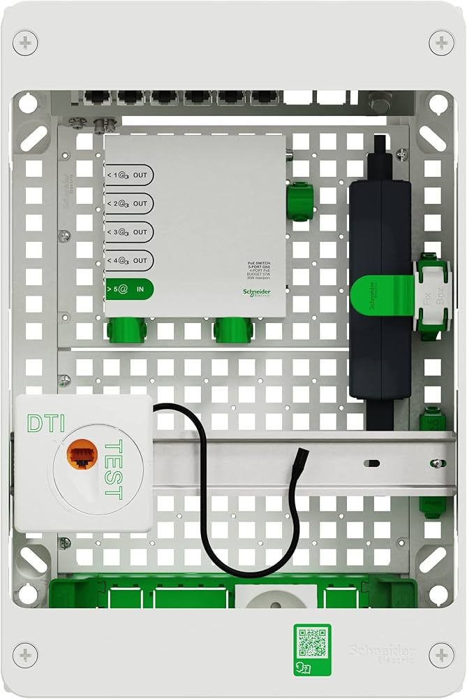Sur les chantiers résidentiels modernes, on voit également émerger l’idée d’un réseau unique pour toute la maison. Avec le développement des maisons connectées, alimenter panneaux tactiles, enceintes encastrées, interphones vidéo et caméras IP depuis le tableau de communication devient de plus en plus courant. Schneider Electric, par exemple, propose des coffrets VDI intégrant directement des switches PoE pour rationaliser l’ensemble.