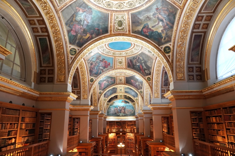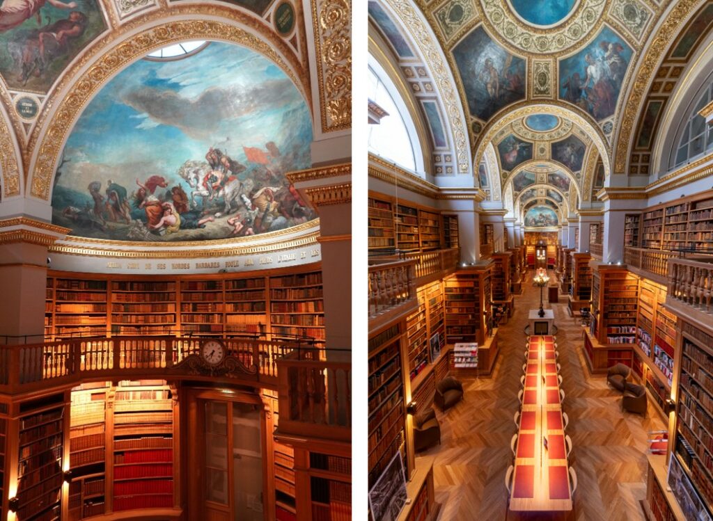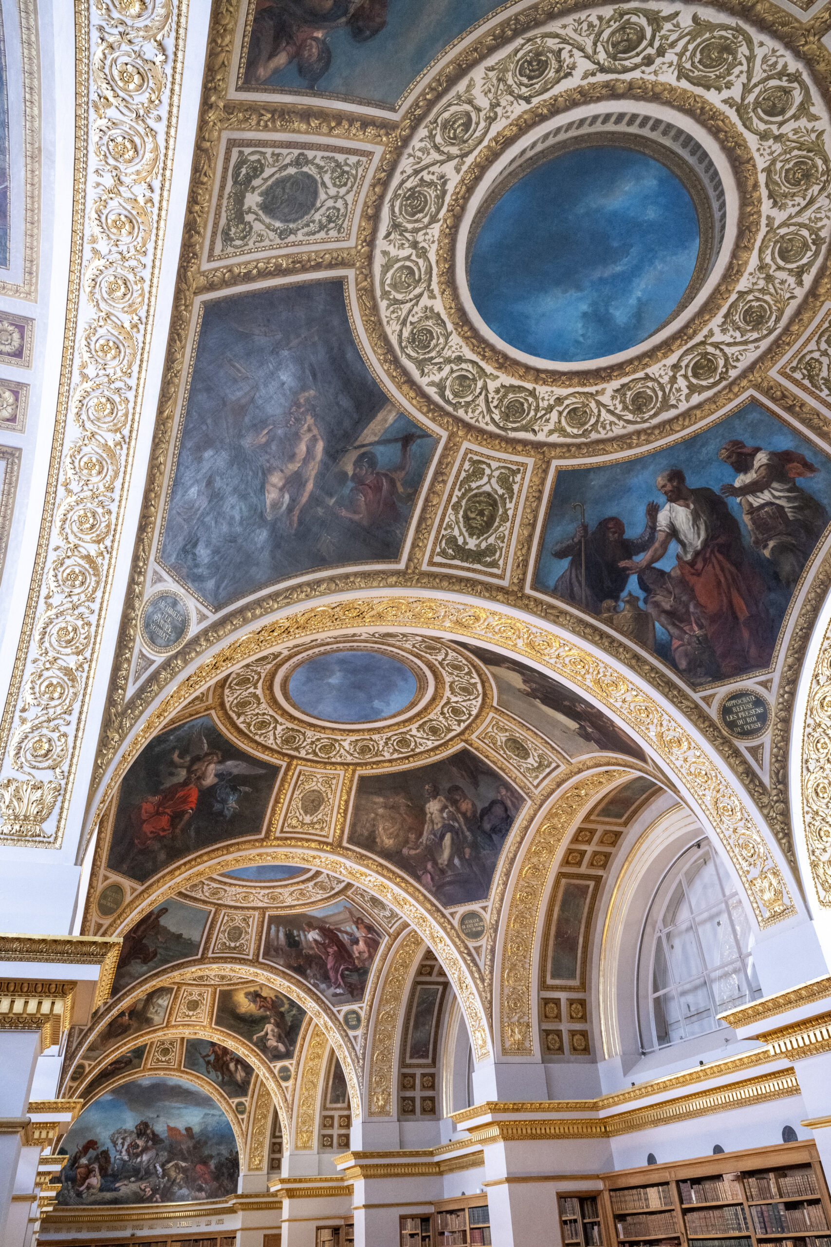 En 1838, Eugène Delacroix fut chargé de la décoration de la bibliothèque. Le peintre y a incarné, en cinq coupoles et vingt pendentifs, la Science, la Philosophie, la Législation, la Théologie et la Poésie, représentées dans des scènes allégoriques chaudes en couleurs. Les cinq thématiques choisies pour les coupoles structuraient jadis le classement des livres ; deux culs-de-four, à chaque extrémité, représentent la Guerre et la Paix. Afin de préserver la fresque tout en apportant un confort visuel optimal aux lecteurs, les concepteurs lumière ont suggéré des compromis sur les niveaux d’éclairement tout en offrant une lumière suffisante et apaisante.