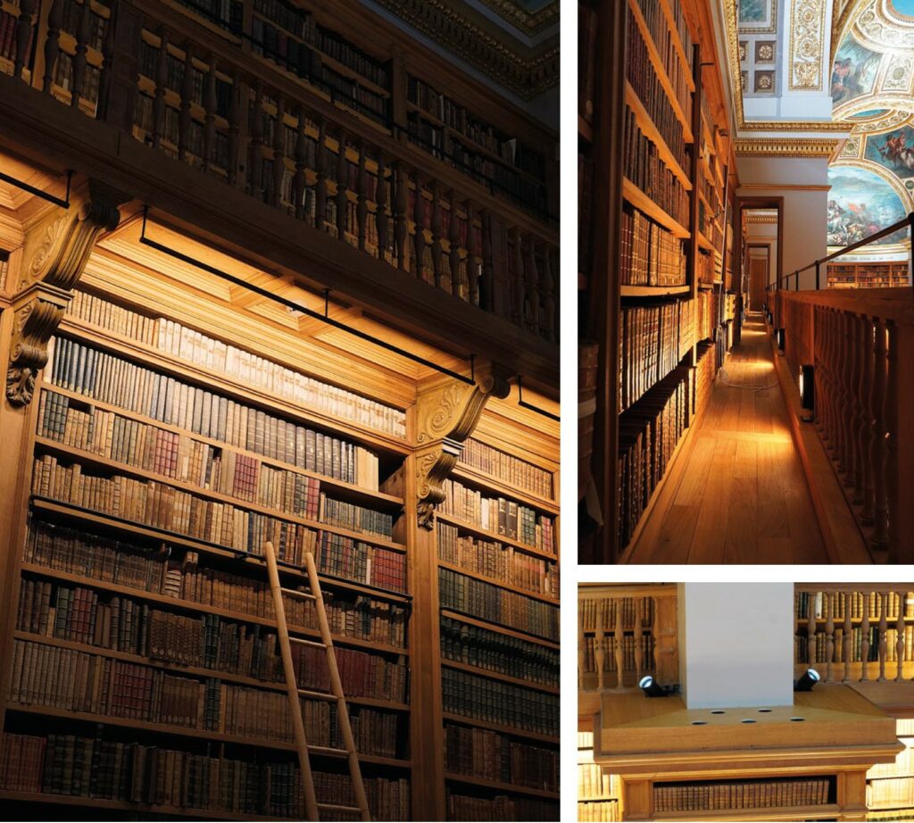 Le diagnostic d’éclairage, commencé en 2022, complété par des études plus récentes et un chantier test en 2025 a montré que les fragilités structurelles de la bibliothèque menaçaient à terme l’intégrité des peintures et compromettaient la conservation des ouvrages dans la nef. Pour permettre des travaux limitant les gênes pour les usagers, deux chantiers simultanés ont été mis en œuvre : l’un en partie inférieure, l’autre sur un platelage suspendu au-dessus de la corniche afin de permettre aux 33 restaurateurs d’œuvrer au plus près du plafond et des peintures de Delacroix. Cette restauration d’ampleur a également été l’occasion du ponçage des bibliothèques en chêne clair de Hollande, du dépoussiérage des 54 000 livres anciens de la collection, de la pose d’un parquet à l’image de celui d’origine et, enfin, de l’introduction d’un nouveau mobilier adapté aux méthodes de travail actuelles.
