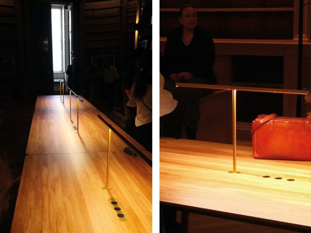 Des lignes lumineuses horizontales très fines (dotées d’un IRC de 90), orientables, fixées sous la balustrade et devant les rayonnages éclairent les livres jusqu’en bas uniformément d’une lumière douce et chaude (2 700 K) et sont complétées par des petites appliques à émission directe (vers le sol) et indirecte (vers les culs-de-four) posées sur les piles. « Pour la mezzanine, nous avons dessiné et fait fabriquer sur mesure un luminaire, fixé sur la balustrade en chêne. Les optiques permettent d’éclairer très précisément le rayonnage sans fuite de lumière », détaille Raphaël Jayol.