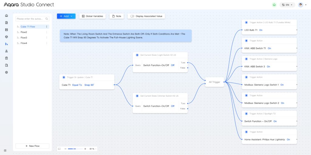 Le logiciel Aqara Studio Connect, une version allégée mais puissante d’Aqara Studio, fonctionne uniquement sur ce hub. Il propose une interface web ergonomique, pensée pour faciliter la gestion sans installation supplémentaire. L’intégrateur accède à distance à toutes les configurations, réalise la maintenance, supervise les appareils résidentiels ou collectifs, et bénéficie d’un éditeur d’automatisations complet basé sur des flux (“drag and drop”). Plus question de coder des scénarios complexes : la création d’enchaînements intelligents entre équipements se fait visuellement, de façon rapide et fiable. Ce gain de temps et cette simplicité sont devenus incontournables pour les professionnels confrontés à des projets multifaces ou évolutifs, et à des clients de plus en plus exigeants.