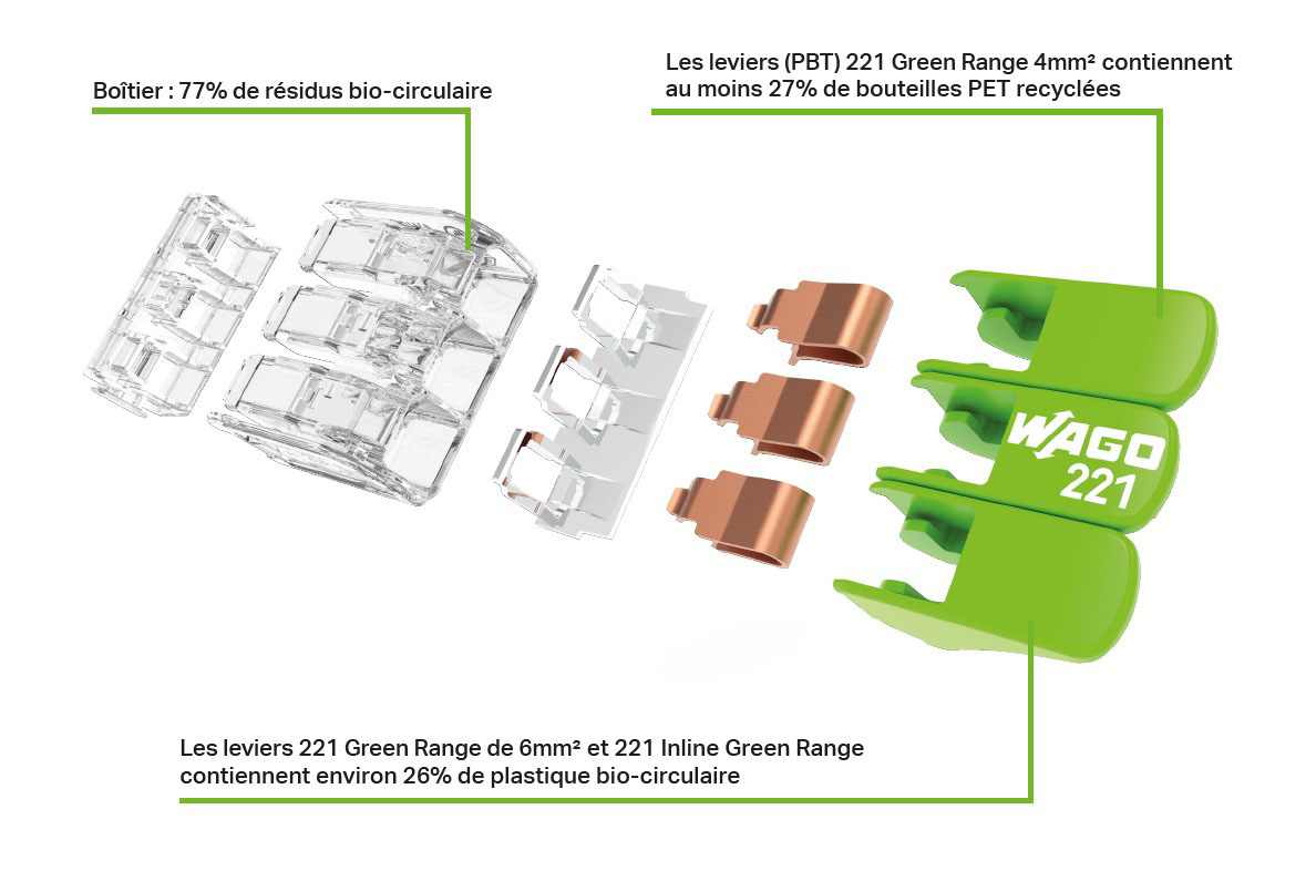 La gamme 221 Green Range intègre des matériaux recyclés et biosourcés. © Wago