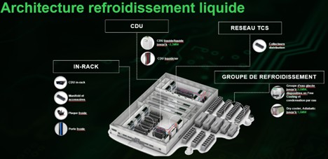 (Cooling Distribution Unit), qui a pour rôle de séparer le réseau noble TCS (Technology Cooling System) de l’installation refroidissement liquide vers le réseau FWS (Facility Water System) du bâtiment, que j’aime appeler réseau standard. Le CDU a également pour rôle de maintenir le débit, la pression et la température dans le réseau TCS, mais encore de filtrer de manière très fine l’eau de ce réseau TCS afin de protéger les serveurs informatiques des surchauffes. Ensuite, les calories sont transmises vers le réseau standard du bâtiment et sont rejetées en fonction de la technologie utilisée. »