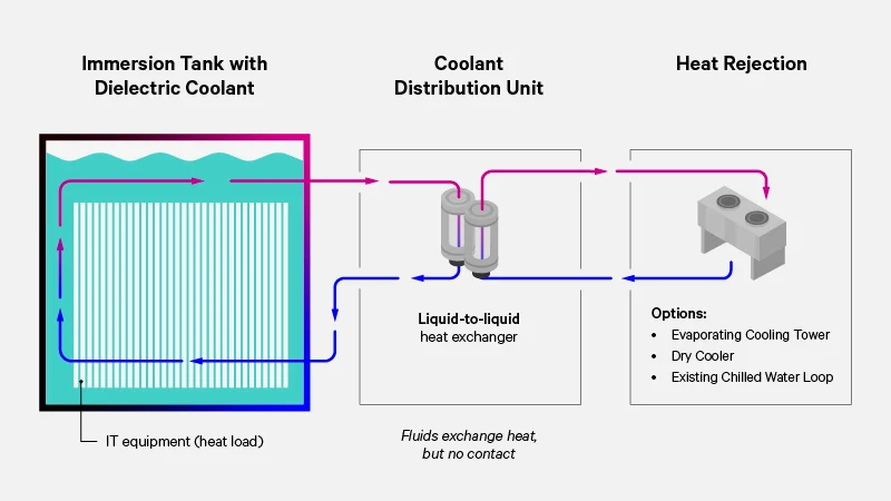 · Immersion monophasée : le liquide de refroidissement absorbe la chaleur et circule à travers des échangeurs de chaleur.