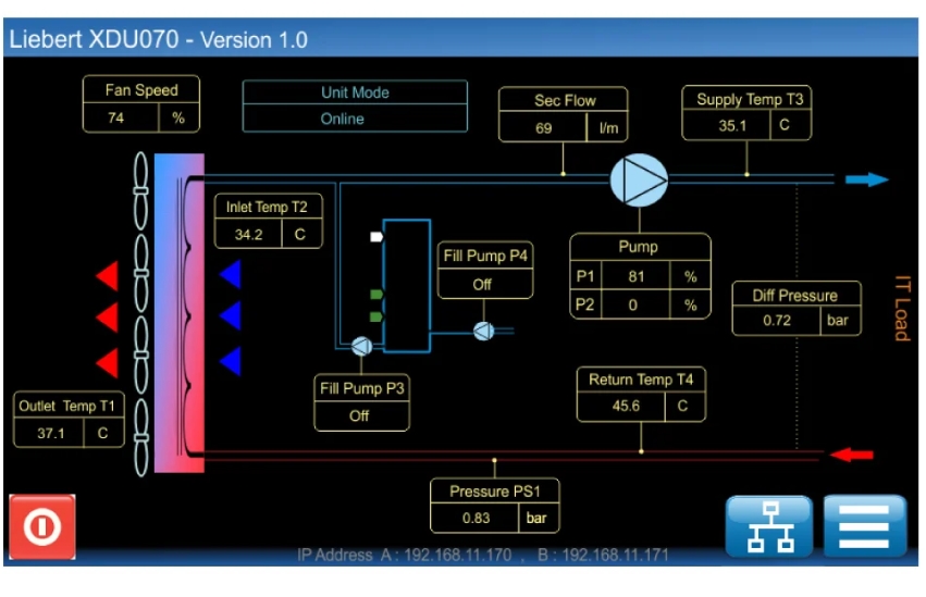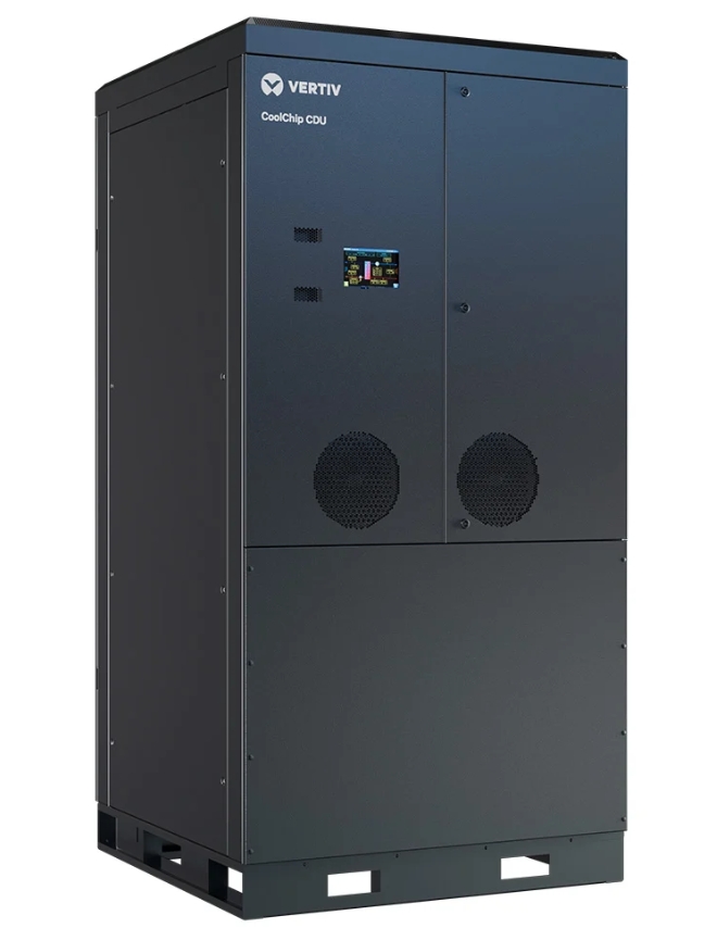 · Vertiv™ CoolChip CDU 70, une unité de distribution de liquide de refroidissement liquide-air en rangée qui permet une entrée rapide et économique dans le refroidissement liquide pour les datacenters qui rénovent des environnements existants ou qui déploient une nouvelle infrastructure. Conçu pour utiliser l’infrastructure thermique existante, ce CDU liquide-air est idéal pour les installations souhaitant déployer une capacité de refroidissement liquide sans recourir à des changements majeurs d’infrastructure. Le système fournit jusqu’à 70 kW de puissance frigorifique et aide à réduire la complexité du réseau de fluide secondaire et l’encombrement de l’infrastructure.