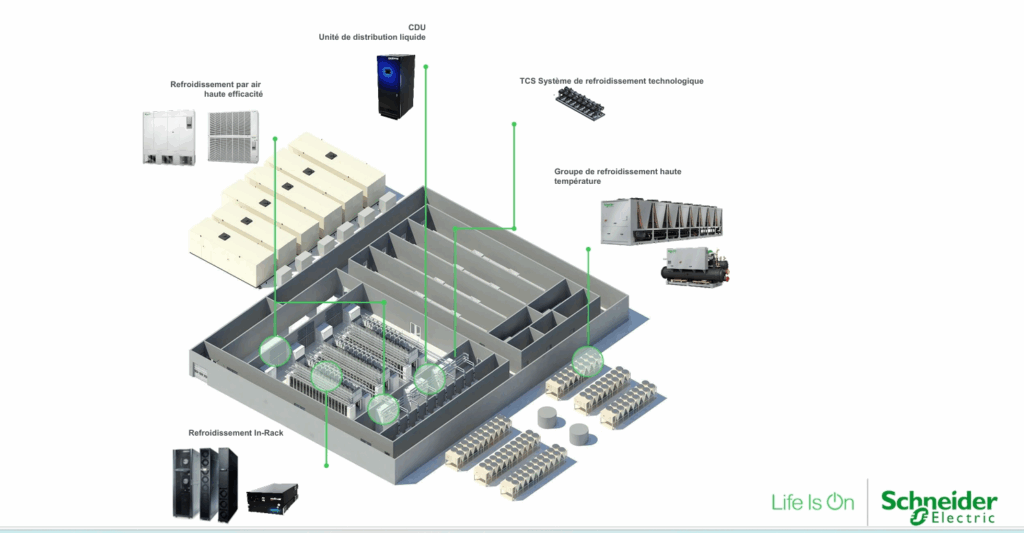 Gaël Roquain donne l’exemple des différentes solutions proposées par Schneider Electric en matière de refroidissement du processeur à l’évacuation de la chaleur à l’extérieur du bâtiment, le « chip to chiller ». « Ce rejet à l’extérieur se fait notamment grâce à des équipements comme des groupes d’eau glacée ou des dry coolers, que nous proposons. Mais nous commercialisons également d’autres équipements qui permettent de traiter l’air résiduel en salle informatique, comme les armoires de refroidissement, les portes froides, les baies de refroidissement InRow. À l’inverse, si l’exploitation d’une salle impose de laisser cet espace neutre, nous pouvons également proposer des Fanwalls, sorte d’armoires de refroidissement de grande taille.