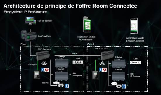 Dans les bâtiments soumis au décret tertiaire, la GTB peut s’appuyer sur un réseau backbone IP pour centraliser les données. Ce réseau fédère des contrôleurs intelligents par zone, qui communiquent généralement en BacNet IP et intègrent pour la gestion d’éclairage les protocoles DALI, ou encore via des passerelles KNX/Modbus selon les configurations. « Il s’agit de créer un écosystème homogène et communicant, tous les produits sont ainsi connectés à un contrôleur de zone qui gère à la fois la CVC, l’éclairage et les stores, le confort visuel avec un éclairage de qualité, et le confort corporel en agissant sur les paramètres de chauffage, ventilation et climatisation. L’occupant peut ainsi gérer l’ensemble des paramètres température, éclairage stores sur une même application », poursuit l’expert de Schneider Electric.