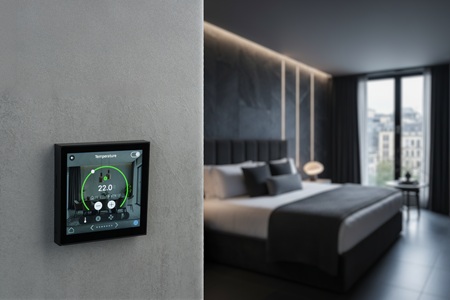 Ces contrôleurs d’ambiance sont plus qu’un simple écran tactile : pour citer un exemple, le contrôleur iONprime de Theben intègre quatre capteurs – thermostat, hygrométrie, luminosité, détection de proximité – et permet ainsi de piloter éclairage, stores, CVC et scénarios variés. Le contrôleur devient la pièce maîtresse à la fois du confort et de la maîtrise énergétique de la chambre, et apporte la réponse aux besoins de gestion locale pièce par pièce selon les décrets BACS et tertiaire. Il est aussi conçu pour être simple à paramétrer, full KNX, sans plug-in pour le paramétrage dans ETS.