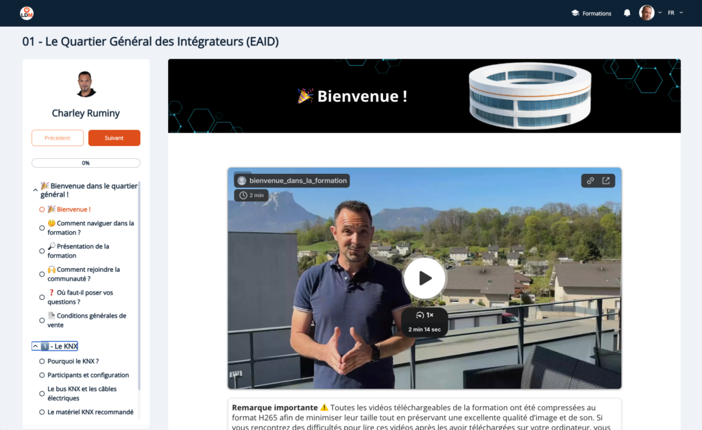 C. R. J’ai conçu un accompagnement complet et pratique. Clairement, c’est ce dont j’aurais rêvé à mes débuts : ça m’aurait évité bien des galères et fait gagner plein de temps ! Je suis ravi aujourd’hui d’aider des collègues en leur transmettant tout ce que j’ai appris sur le terrain. Mon accompagnement se fait à distance, avec des vidéos explicatives et des exemples filmés (rendez-vous réels avec certains de mes clients, vidéos où je montre concrètement comment je programme des installations complexes…). Cela permet à chacun de réécouter les explications autant de fois qu’il le veut et de progresser à son rythme, depuis n’importe où, même hors de France. Mon accompagnement comprend une formation technique organisée en six étapes : révision des bases théoriques (KNX, DALI, réseau, multimédia, etc.), analyse des besoins des clients, étude domotique avec plans et schémas, listing et commande du matériel, programmation (avec des astuces), puis livraison finale et derniers ajustements. Il y a aussi tout un volet commercial pour apprendre à attirer les bons clients sans démarche agressive, notamment grâce au référencement local (Google My Business), à YouTube et à la gestion des avis clients. Je fournis aussi des documents types, des checklists et des éléments à importer d’un clic pour éviter les erreurs classiques, gagner un temps fou et gérer ses chantiers de façon professionnelle. Chose très importante : il y a un suivi régulier, puisque 2 à 3 fois par mois, j’organise des webinaires où les membres de l’accompagnement peuvent me poser des questions aussi bien sur leurs chantiers que sur la formation. Pour les aider encore plus, j’ai même créé une communauté active où les intégrateurs échangent leurs expériences et peuvent s’entraider, y compris pour sous-traiter ou partager des chantiers. Mon programme couvre les principaux produits que j’utilise, comme le KNX pour avoir une base filaire professionnelle, que je complète souvent par quelques objets connectés grand public.
