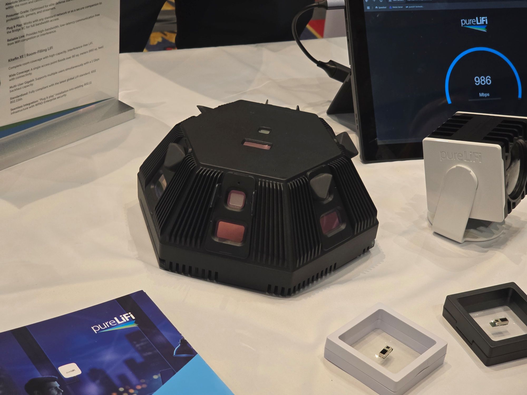 Sur la partie plus “défense / industriel”, pureLiFi met en avant Kitefin XE, une solution LiFi annoncée comme un point d’accès couvrant plus de 80 m², avec une connectivité haut débit, faible latence, et surtout sans radiofréquences. L’argument est simple : fournir du sans-fil là où le Wi-Fi est inadapté (sécurité, contraintes RF, interférences, politique SSI, zones sensibles…).