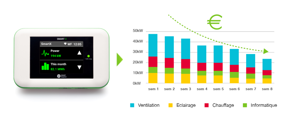 C’est là que Smart Impulse simplifie la mise en conformité. Le Smart X est un compteur innovant qui s’installe en moins d’une heure, sans coupure électrique. Les consommations électriques sont désagrégées par usage grâce à nos algorithmes d’IA (éclairage, ventilation, chauffage, climatisation, etc.). Cela fournit une vision claire de quels équipements consomment à quel moment pour construire les UES, les IPÉ et alimenter les plans d’action d’économies d’énergie. Les données Smart Impulse sont accessibles via une plateforme en ligne ou peuvent être intégrées dans d’autres outils de management de l’énergie, et notre équipe d’expert énergétique accompagne nos clients dans la mise en œuvre de leur démarche.