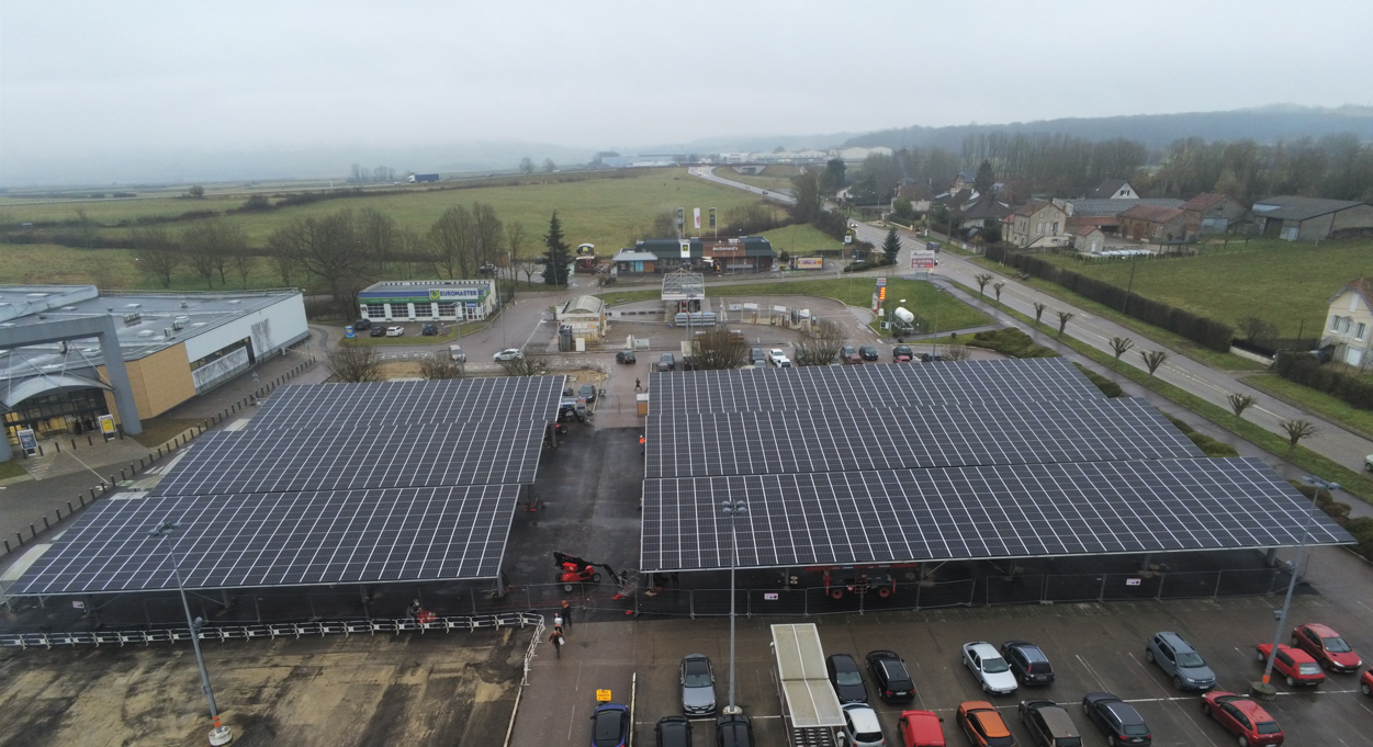Vue d’une ombrière photovoltaïque sur le parking d’un commerce. © R3