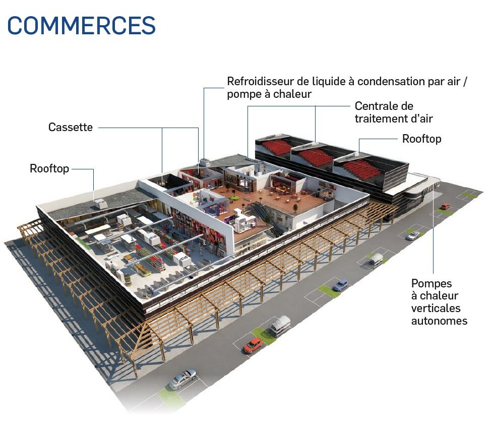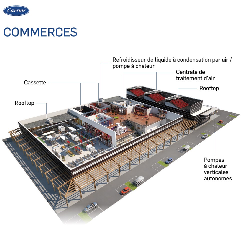 Positionnement des différents équipements CVC dans les commerces. © Carrier