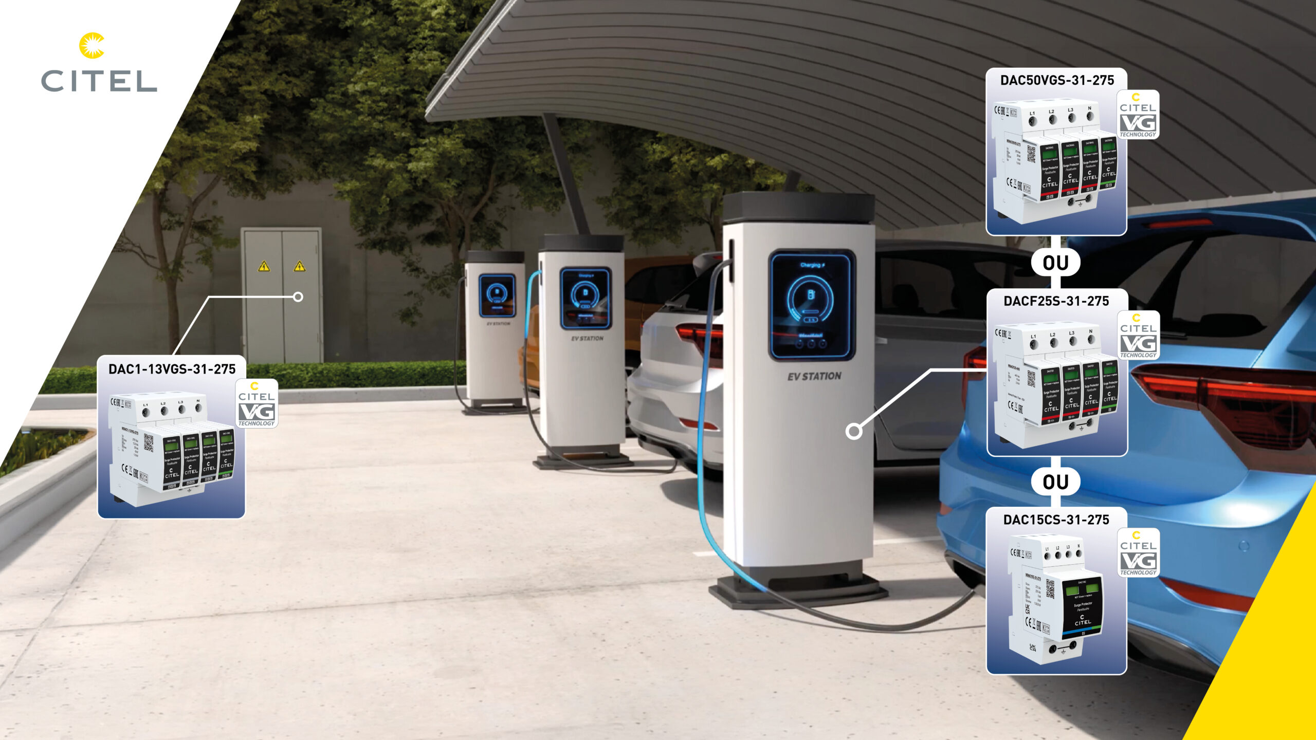 Si l’architecture de la station de recharge est basée sur un convertisseur courant alternatif/courant continu centralisé et que la longueur de câble entre la borne et ce dernier est supérieure à 10 mètres, alors un parafoudre de type 2 DC doit être installé au plus près de l’équipement. Dehn propose le parafoudre de type 2 DC DEHNguard M DC ACI 1250 FM, lancé en 2025 et prévu pour les fortes puissances. Mersen a développé des protections DC pour sa gamme K2. Citel propose la gamme de parafoudres DDC50, à intégrer dans la borne ou à proximité.